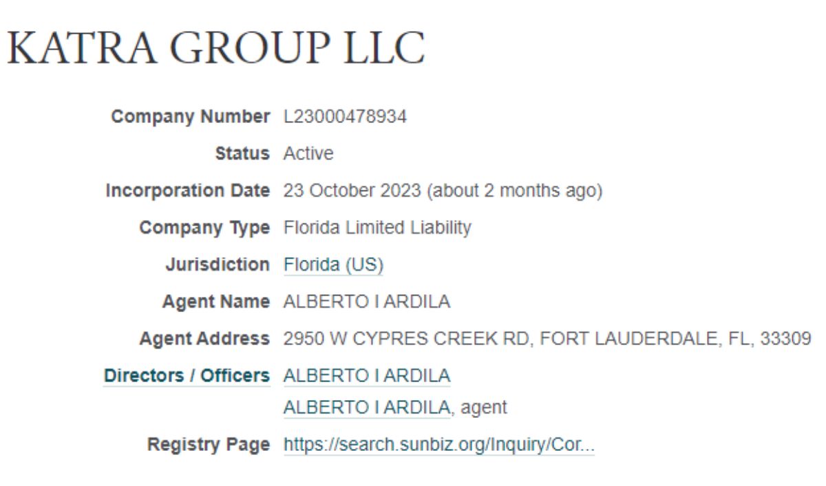 A pesar de su situación, Ardila Olivares no se ha quedado quieto. En octubre de 2023, registró la sociedad KATRA GROUP LLC, en Florida, un estado donde ya tiene antecedentes por su empresa Aeroquest. Se desconoce el objeto y la actividad de esta nueva sociedad, pero no se descarta que pueda estar relacionada con sus antes cuestionados negocios.