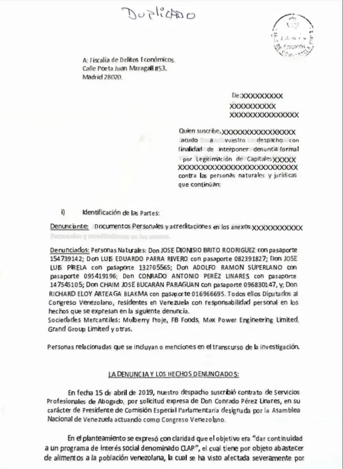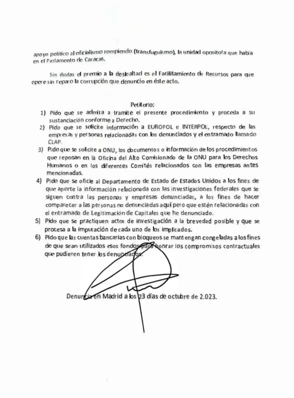 Los demandados son José Brito, Conrado Pérez, Luis Parra, Adolfo Superlano, José Luis Pirela, Chain Bucaran y Richard Arteaga, quienes formaban parte de la Comisión de Contraloría de la Asamblea Nacional de Venezuela, salvo Parra y Pirela, que pertenecían a otras comisiones. Estos diputados viajaron a Europa y firmaron documentos oficiales que trasladaron desde Caracas, con el fin de exonerar de responsabilidad a las empresas involucradas en el caso Clap.