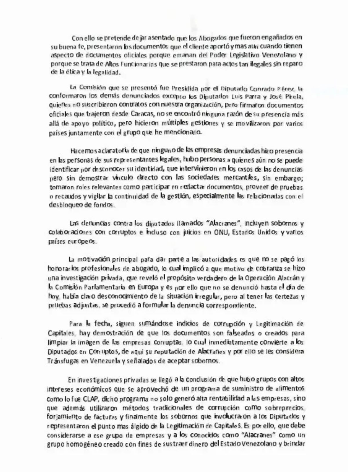 La firma de abogados sostiene que el comportamiento de los antiguos diputados acarrea responsabilidades penales por los delitos de legitimación de capitales y asociación para delinquir. Asimismo, solicita una investigación al respecto y se exhorta a consultar con la ONU y el Departamento de Estado de Estados Unidos información sobre la brutal trama de corrupción. «Para la fecha, siguen sumándose indicios de corrupción y Legitimación de Capitales, hay demostración de que los documentos son falseados o creados para limpiar la imagen de las empresas corruptas, lo cual inmediatamente convierte a los Diputados en Corruptos, de aquí su reputación de Alacranes y por ello se les considera Tránsfugas en Venezuela y señalados de aceptar sobornos», agrega.