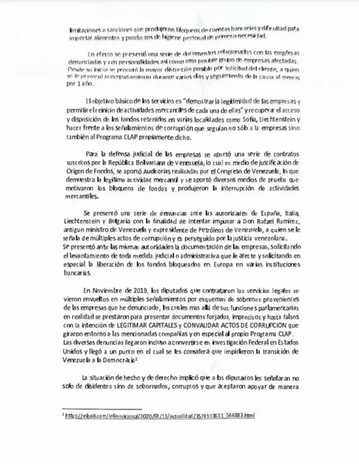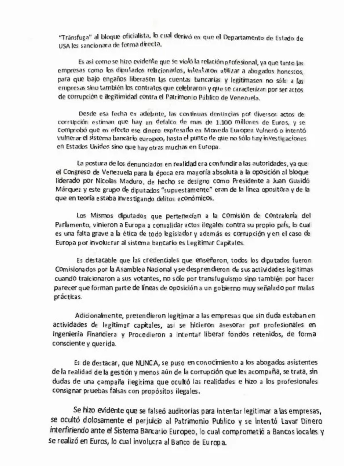 La firma de abogados denuncia que los diputados «intentaron utilizar a abogados honestos, para que bajo engaños liberasen las cuentas bancarias y legitimasen no solo a las empresas, sino también los contratos que celebraron y que se caracterizan por ser actos de corrupción e ilegitimidad contra el Patrimonio Público de Venezuela». Además, afirma que los diputados ocultaron pruebas que evidenciaban la mala calidad de los alimentos y usaron otras para engañar a las instituciones europeas. También señala que los diputados fueron a Bulgaria a defender las empresas que se robaron el dinero de la República de Venezuela, en lugar de pedir que le repatriaran esos dineros al Estado venezolano.