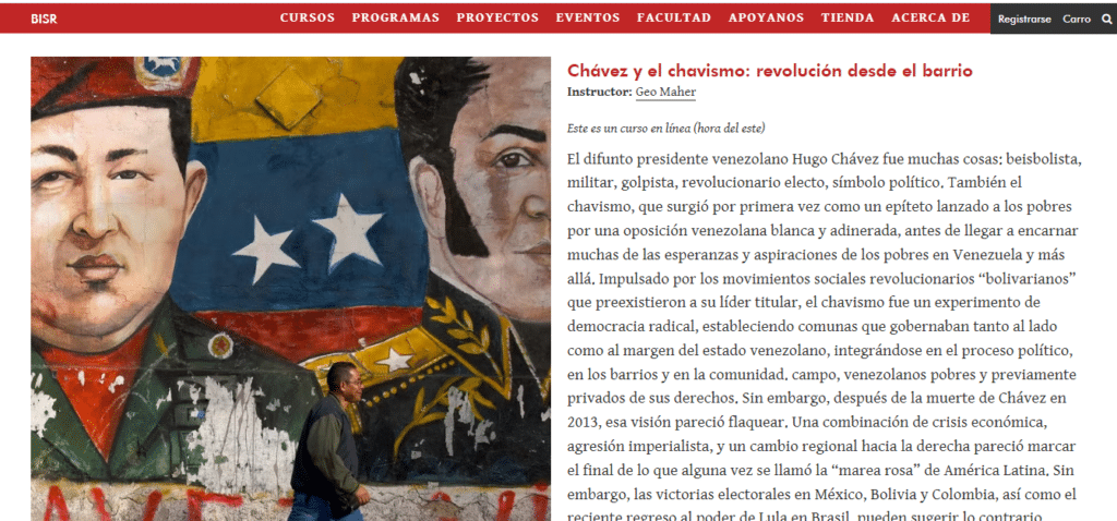 El curso llamado «Chávez y el chavismo: revolución desde el barrio», iniciará el próximo 2 de febrero y tendrá una duración de 4 semanas. Para inscribirse hay que pagar un monto de US$315.
