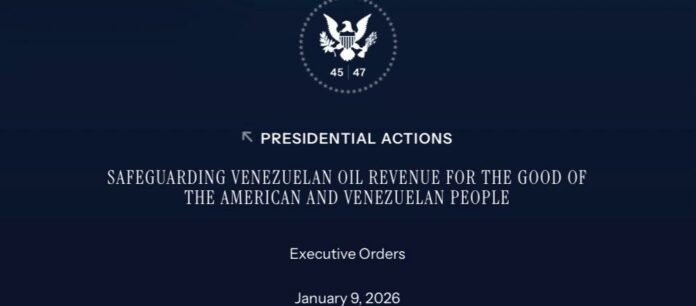 El Gobierno de Estados Unidos emitió el 9 de enero de 2026 un decreto ejecutivo mediante el cual declara una emergencia nacional para proteger determinados fondos del Gobierno de Venezuela vinculados a la venta de petróleo y otros recursos naturales, actualmente depositados y custodiados por el Tesoro estadounidense. Con información de The White House.