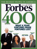 Forbes reporta que al fin de un año de caos económico el valor colectivo de las 400 personas más ricas de NorteAmérica disminuyó en USD 300 mil millones, empujando a 32 magnates que estaban en la lista el año pasado fuera de su clasificación, a pesar de que el patrimonio para ser admitido en la lista disminuyó de USD 1.300 millones a USD 950 millones
