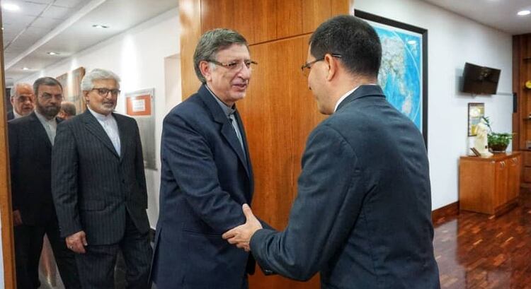 Mohsen Baharvand, delegado del Ministerio de Relaciones Exteriores del régimen de Irán, con Jorge Arreaza, canciller de la dictadura venezolana